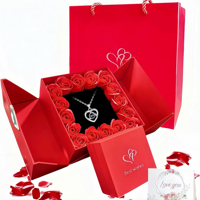 ジュエリー専用サプライズギフトボックスネックレス・リング・ピアス対応|ローズデザイン 開けた瞬間、心に残るサプライズ フタを開けると、美しいローズに包まれたジュエリーが現れる特別な演出。 ただ渡すだけではなく、「開ける瞬間」そのものがプレゼントになる、ロマンチックなギフトボックスです。 ● ジュエリーを美しく魅せる専用設計 ● ネックレス・リング・ピアスをそれぞれ固定できる構造 ● 絡まりにくく、型崩れしにくい安心設計 ● ジュエリーを一番きれいにディスプレイ ● ローズデザインで高級感アップ ● 上品なローズモチーフで特別感を演出 ● 箱だけで「高級感・感動」が一段アップ ● 写真・動画映え抜群のデザイン ● こんなシーンにおすすめ ● 誕生日プレゼント ● 記念日ギフト ● バレンタイン / ホワイトデー ● プロポーズ演出 ● 大切な人へのサプライズ ● 商品ポイント ● ジュエリー専用サプライズギフトボックス ● ネックレス・リング・ピアス対応 ● ローズデザインで高級感演出 ● 開封時のサプライズ効果抜群 ● 写真・動画映えするギフト演出 ● ご購入前のご注意(重要) ● こちらの商品はギフトボックスのみの販売です ● ジュエリー(ネックレス・リング等)は付属しておりません ただの箱じゃない、「記憶に残る演出」 もらった瞬間に驚いて、開けた瞬間に笑顔になる。 このボックスは、ジュエリー以上に 「感動」を贈れるギフトです。