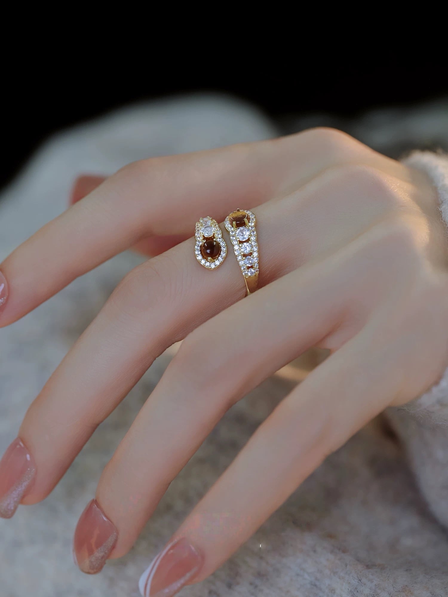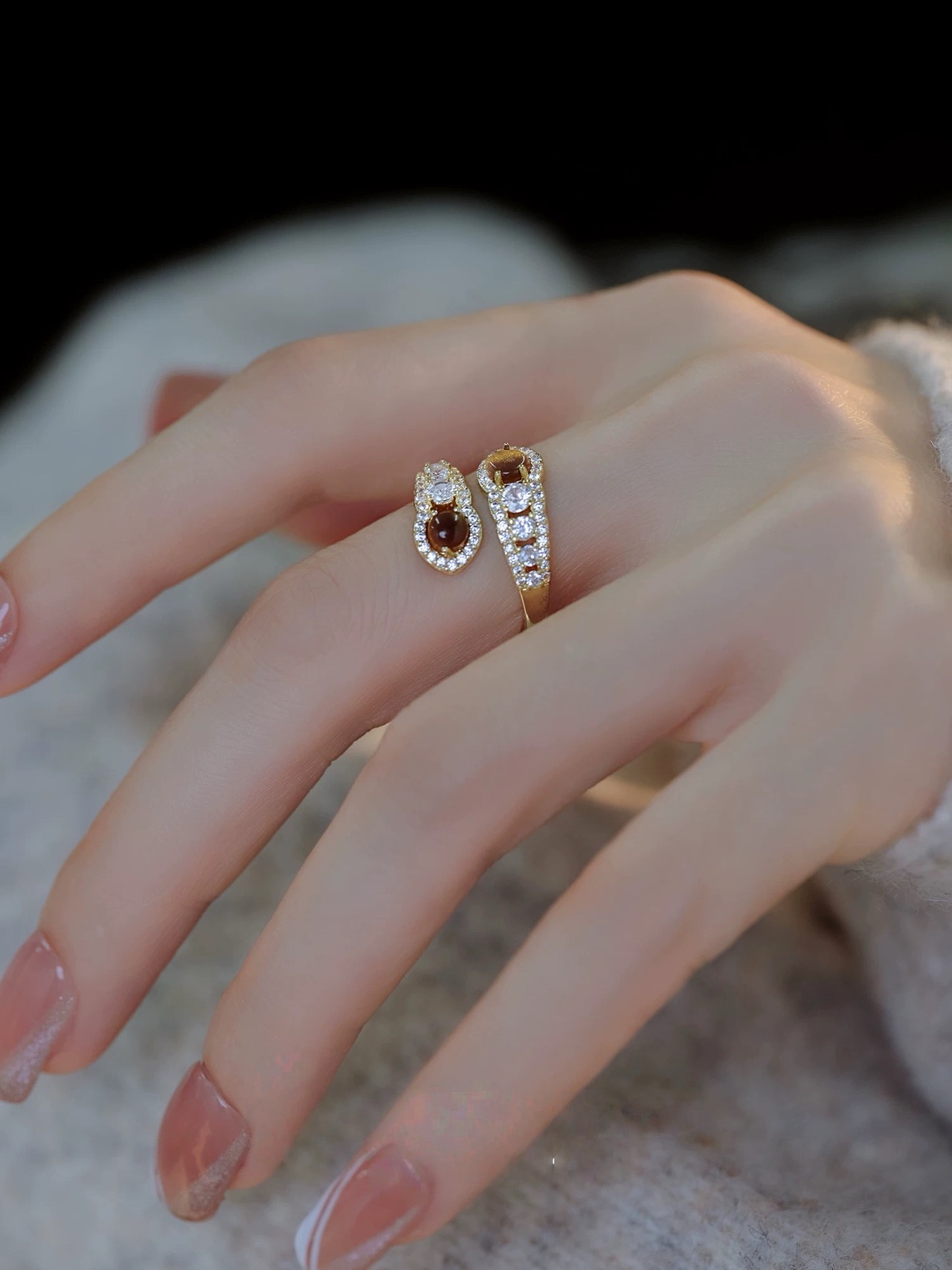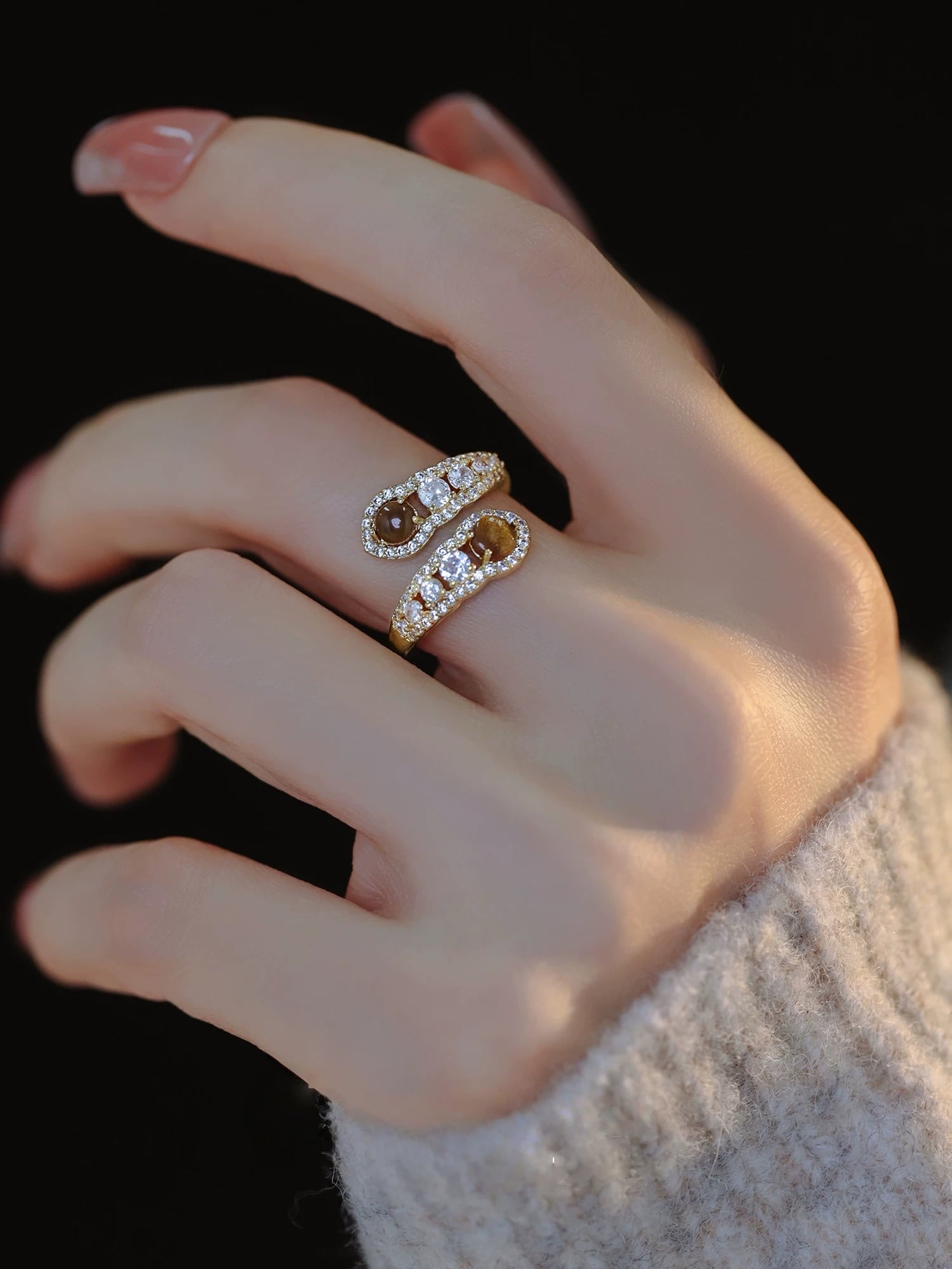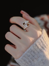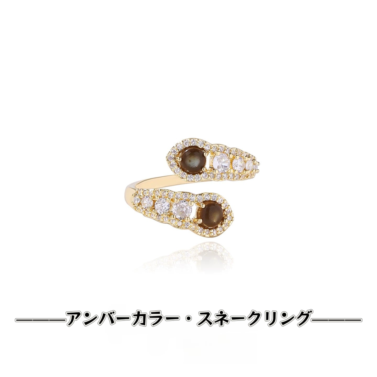94.アンバーカラー・スネークリング|しなやかに絡む蛇のデザインと温かみのある琥珀色が絶妙にマッチ。ゴールドの輝きが手元を上品に彩り、日常からデートまで、大人の遊び心と個性をさりげなくプラスします。