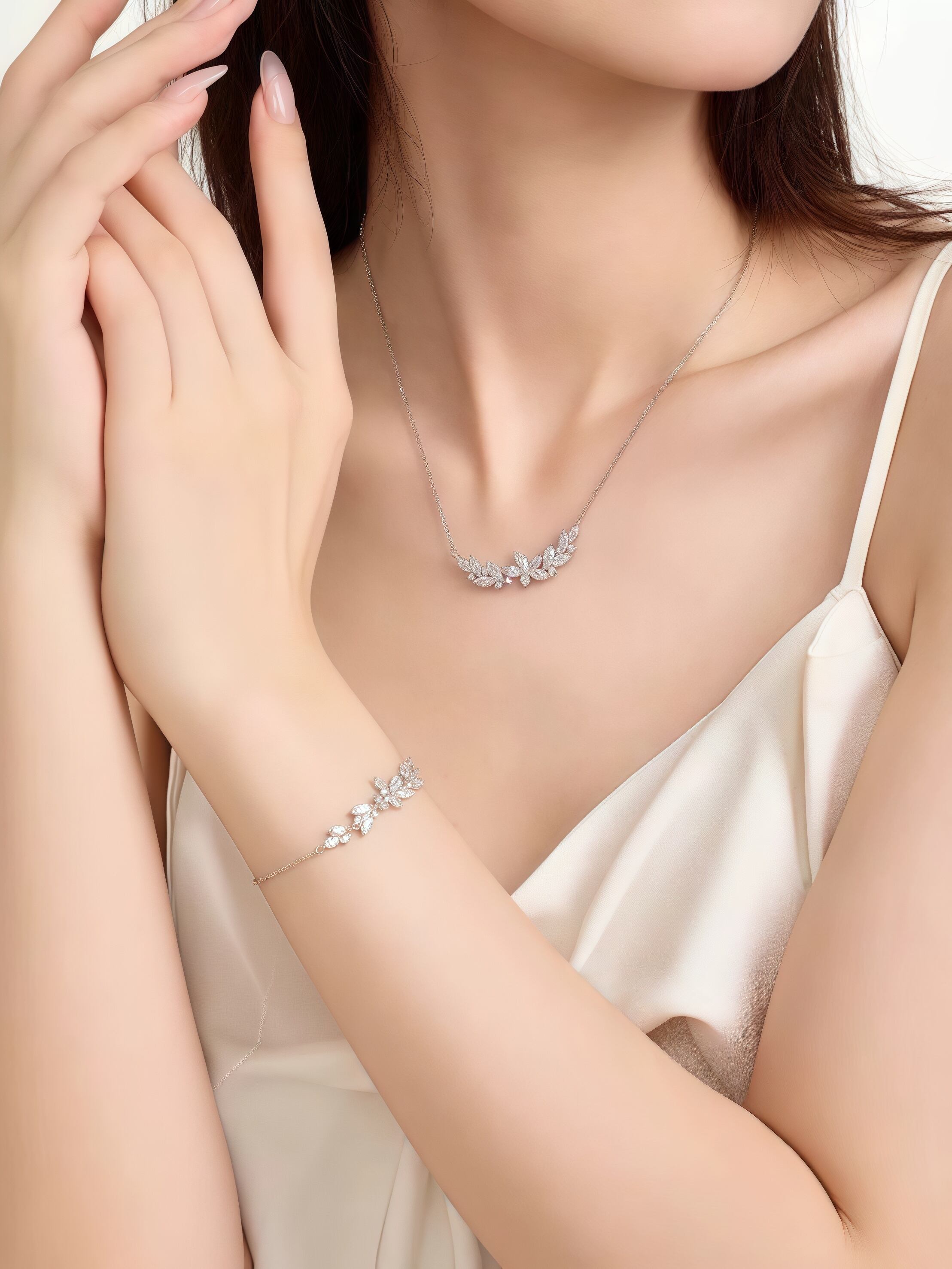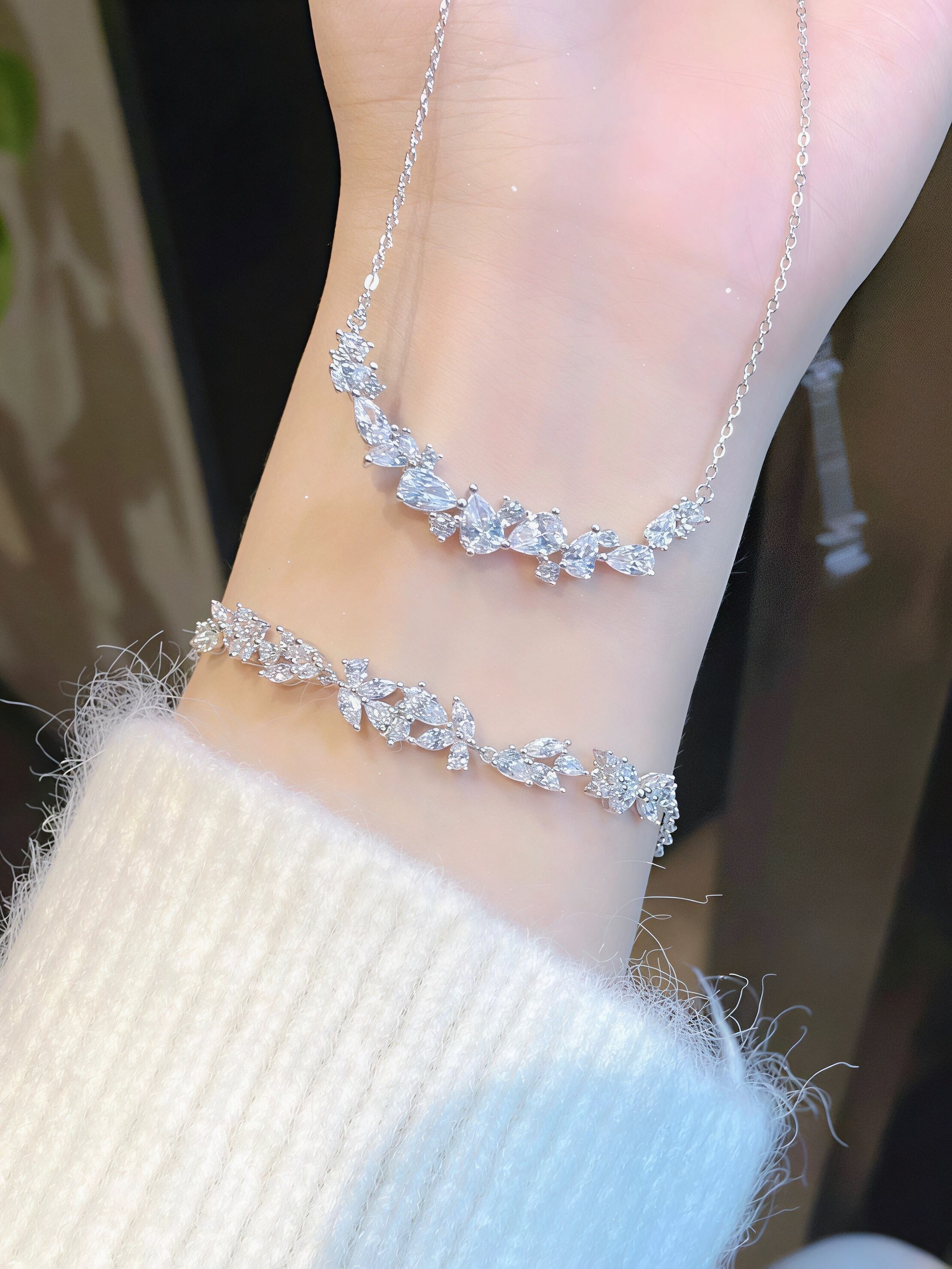 上品で可憐:白藤の花をモチーフにしたデザインで、優しい輝きが胸元と手元を華やかに彩ります。