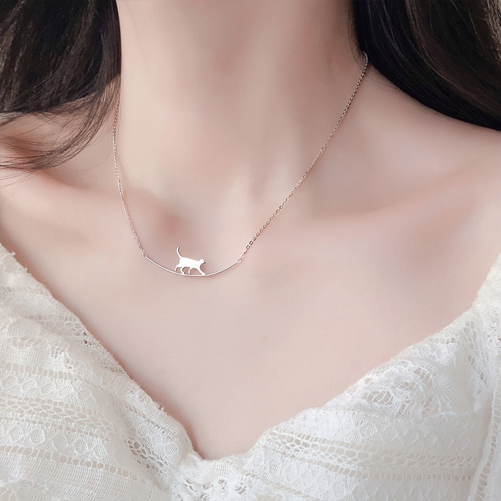 105.925シルバー猫モチーフネックレス|シンプルで個性的なアーチデザイン|首元でさりげなく輝く大人可愛いアクセサリー