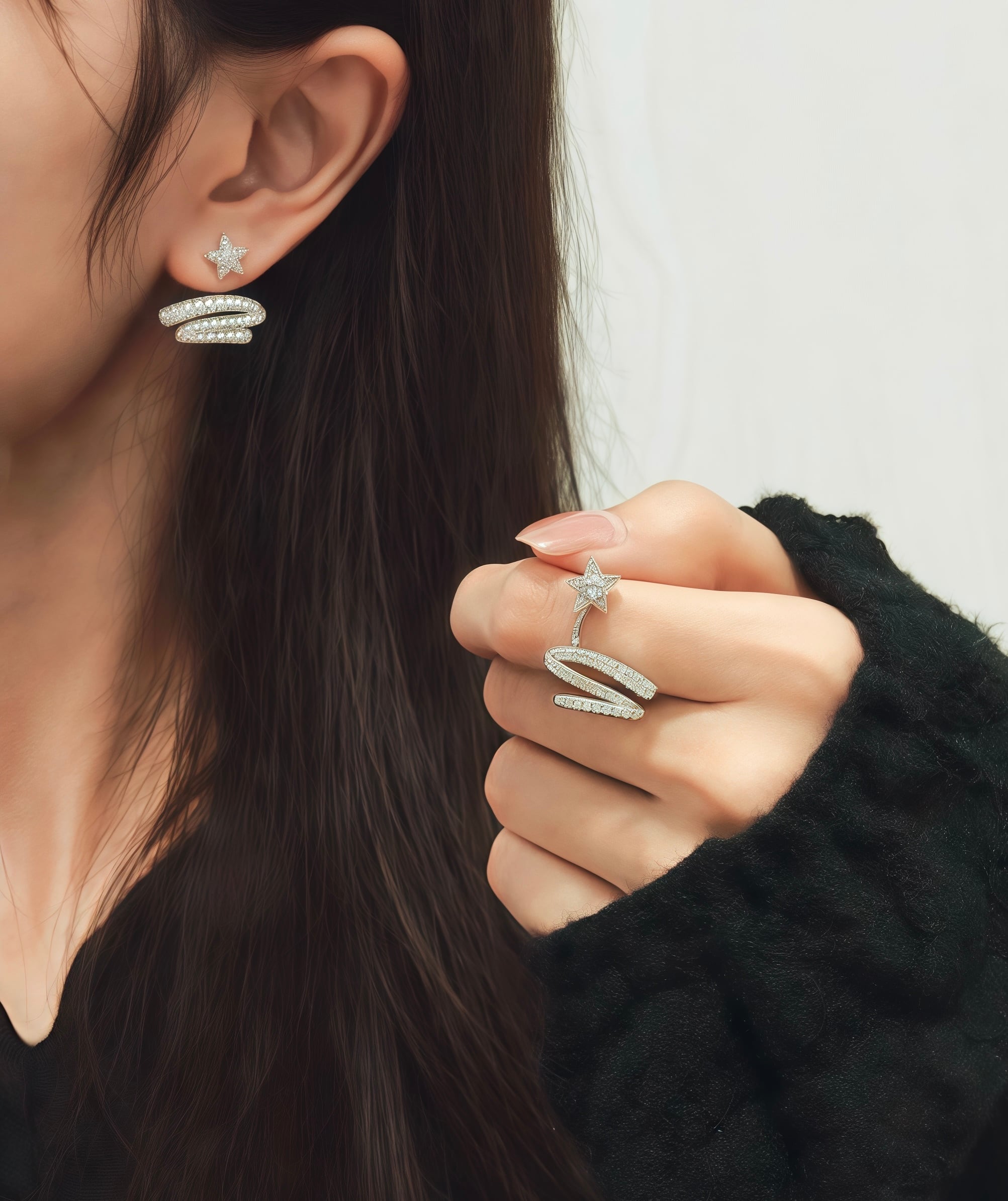 925 シルバーポスト星の光リボンイヤリングは、キラキラとしたジルコニアが星の輝きを胸元に引き寄せる、愛らしいアクセサリーです。スパイラルリボンデザインが特徴的で、柔らかな大人可愛い雰囲気を演出します。デイリー使いから特別なパーティーシーンまで、幅広く活躍する一品です!