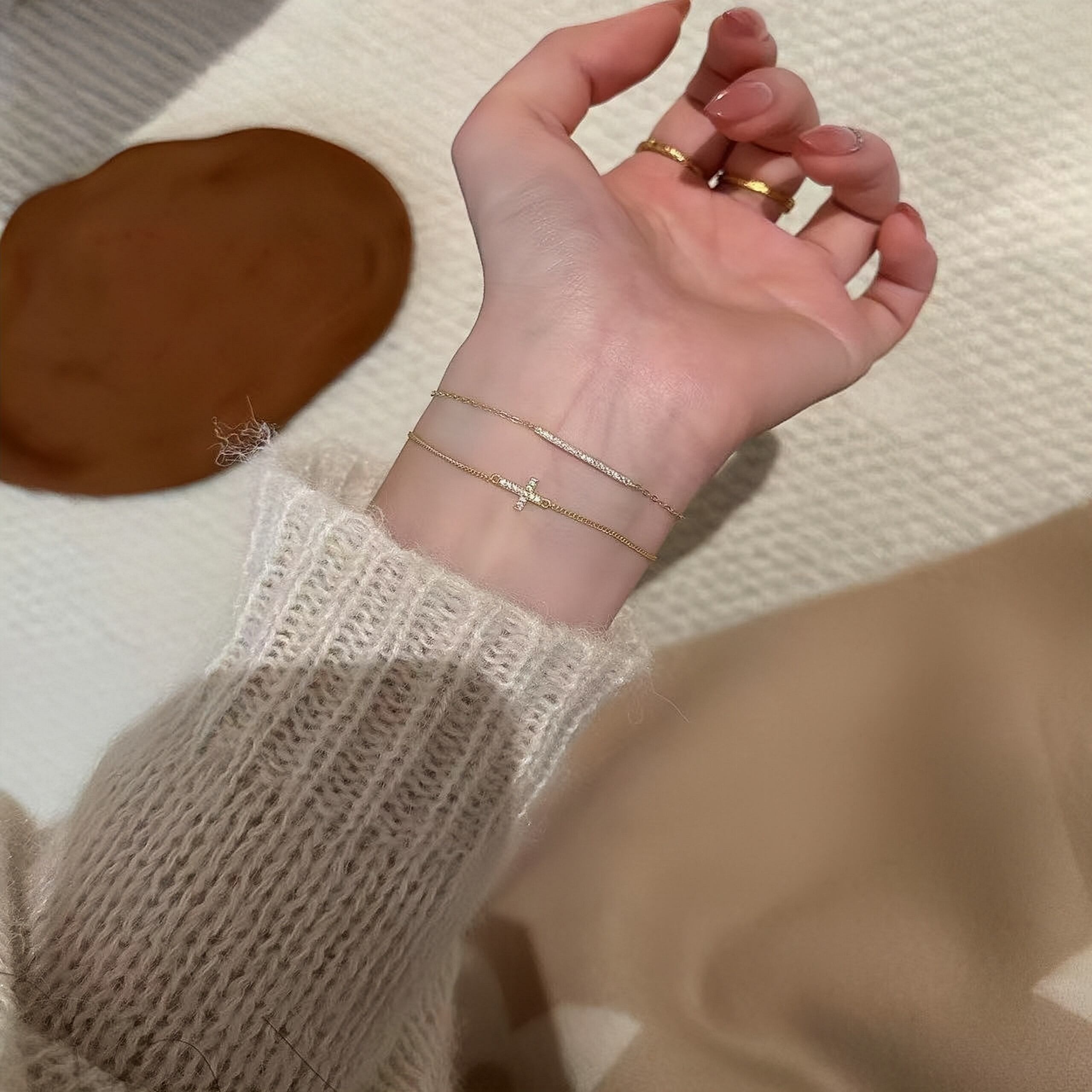 【人気定番】ゴールドクロスブレスレットは、細身のチェーンとミニパヴェワークが融合した洗練されたデザインのアクセサリーです!日常使いからおしゃれコーデまで幅広く活躍し、手首を華やかに演出します。