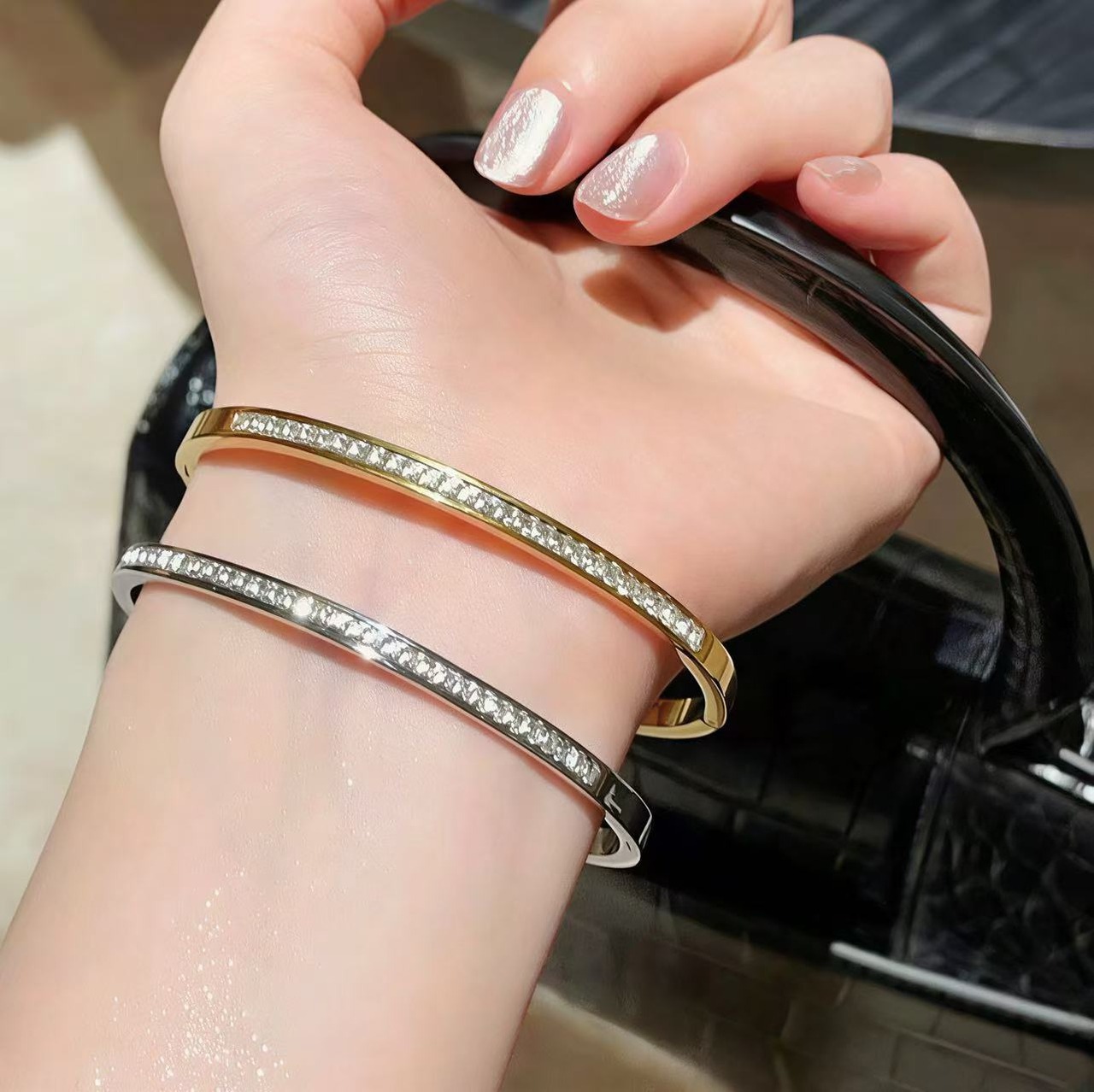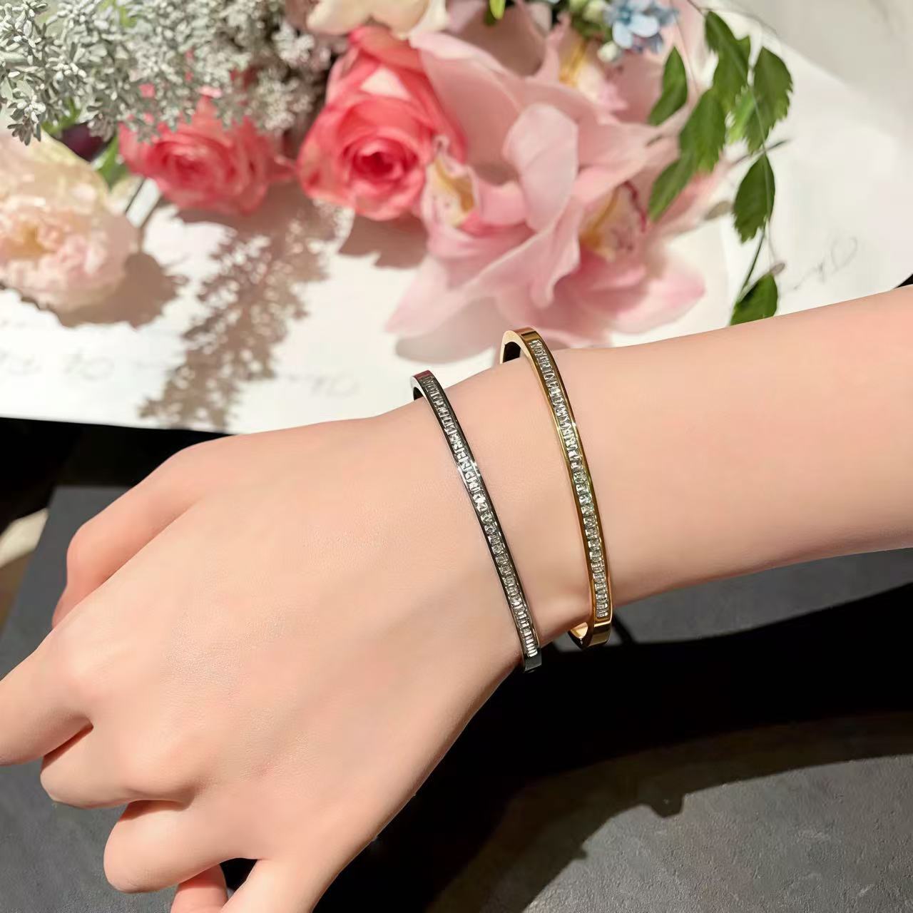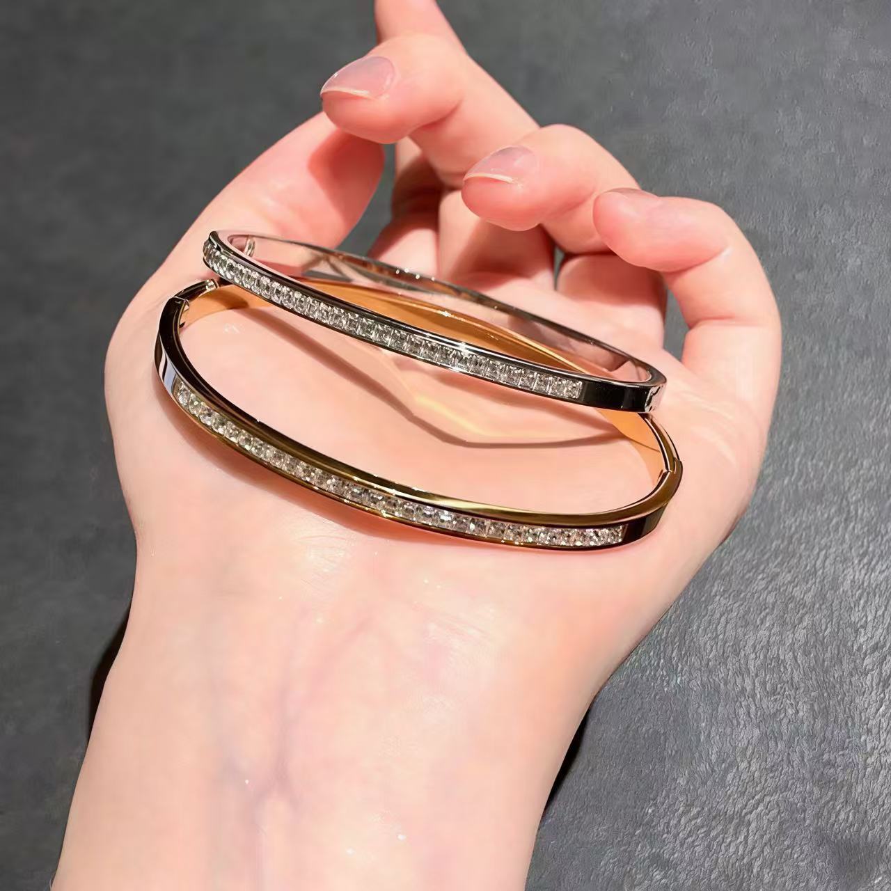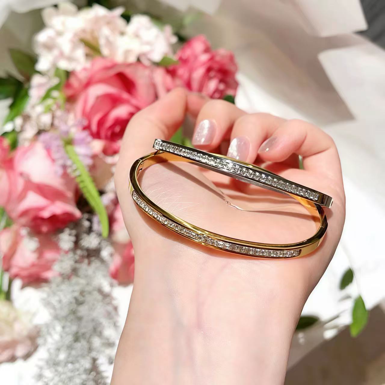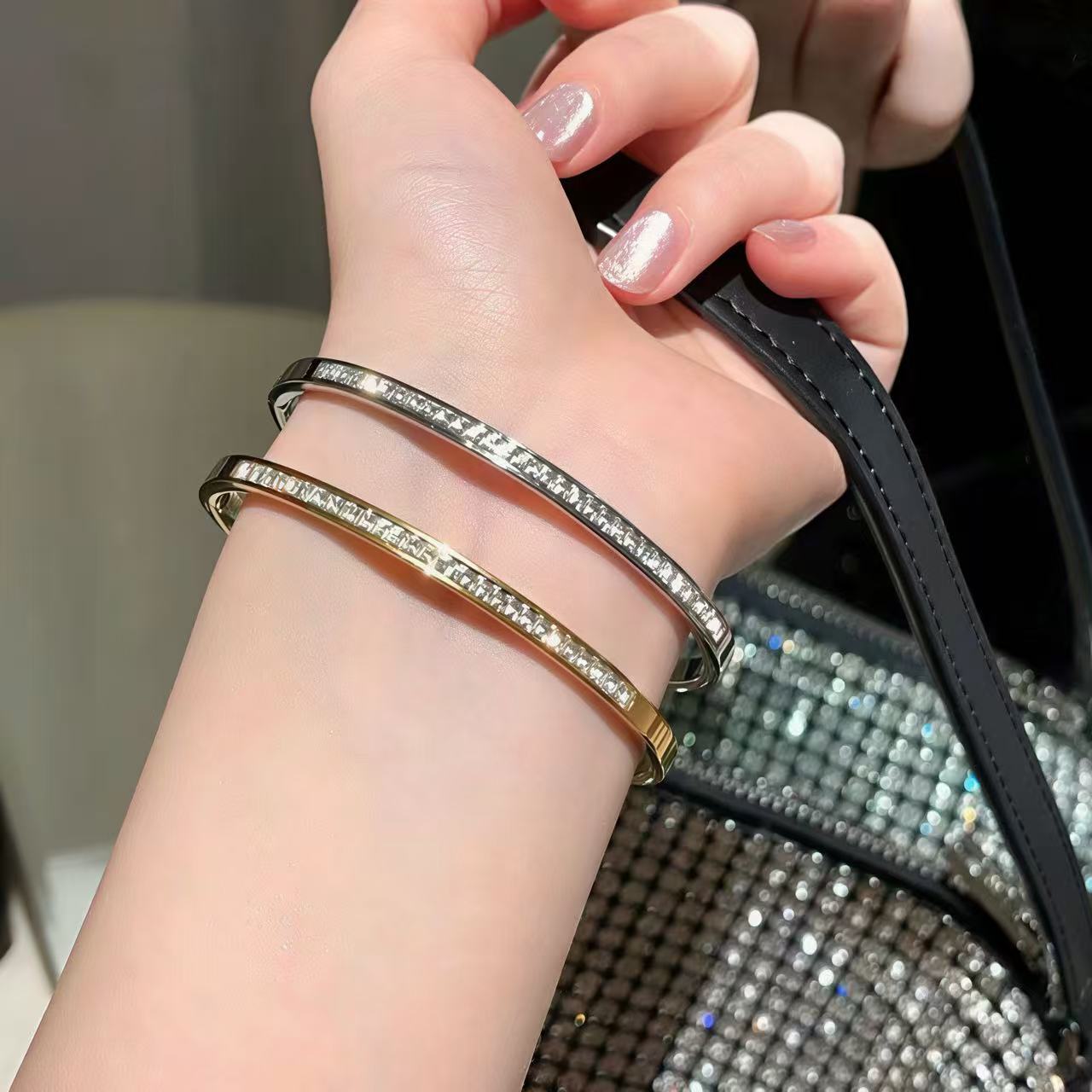 141.ダブルカラー輝きブレスレットオープンデザインで手サイズ不問!ツートーンの光沢が肌に寄り添い、カジュアルな日常にも華やかなデートシーンにもぴったり。小物で造型を彩る、おしゃれ必携アイテムです。