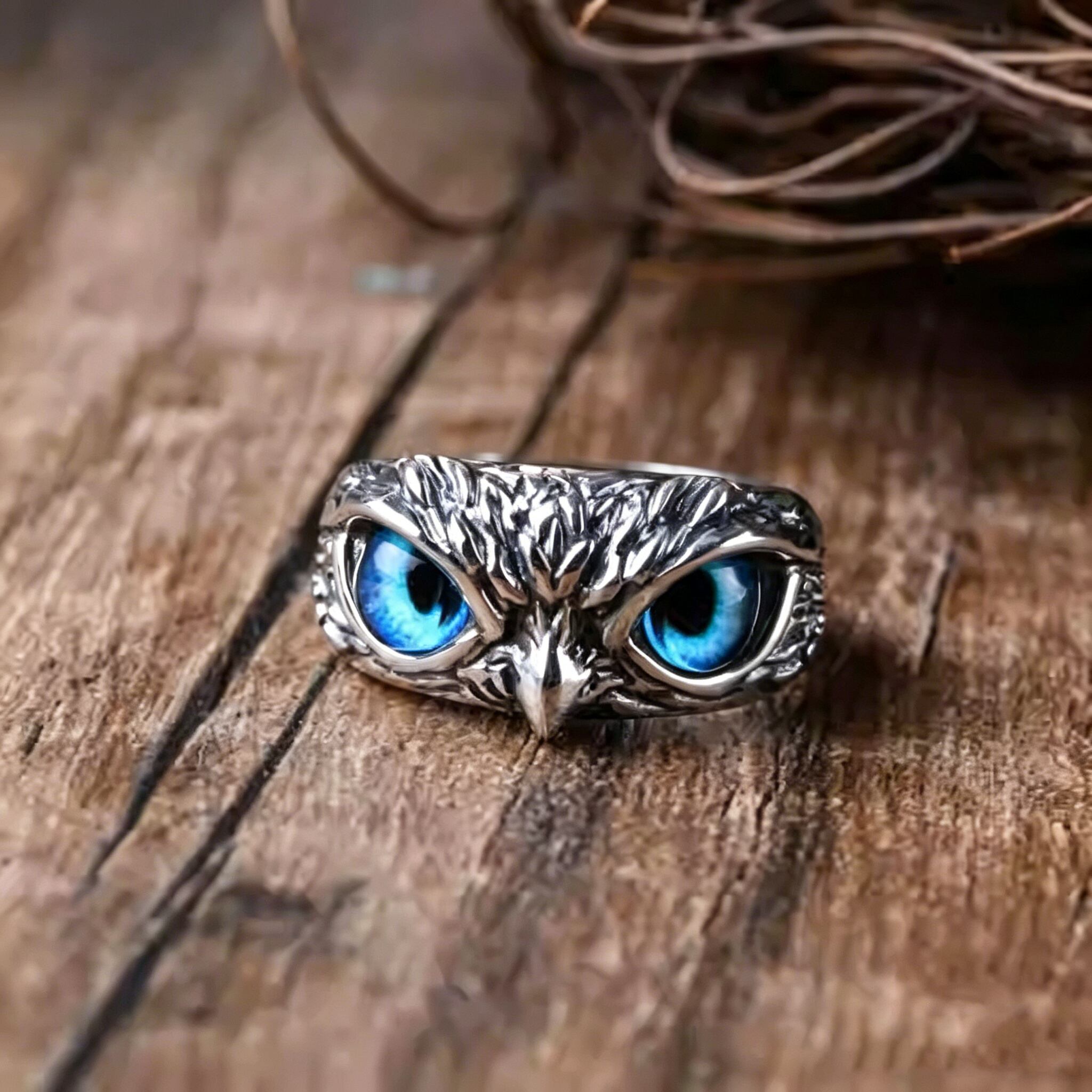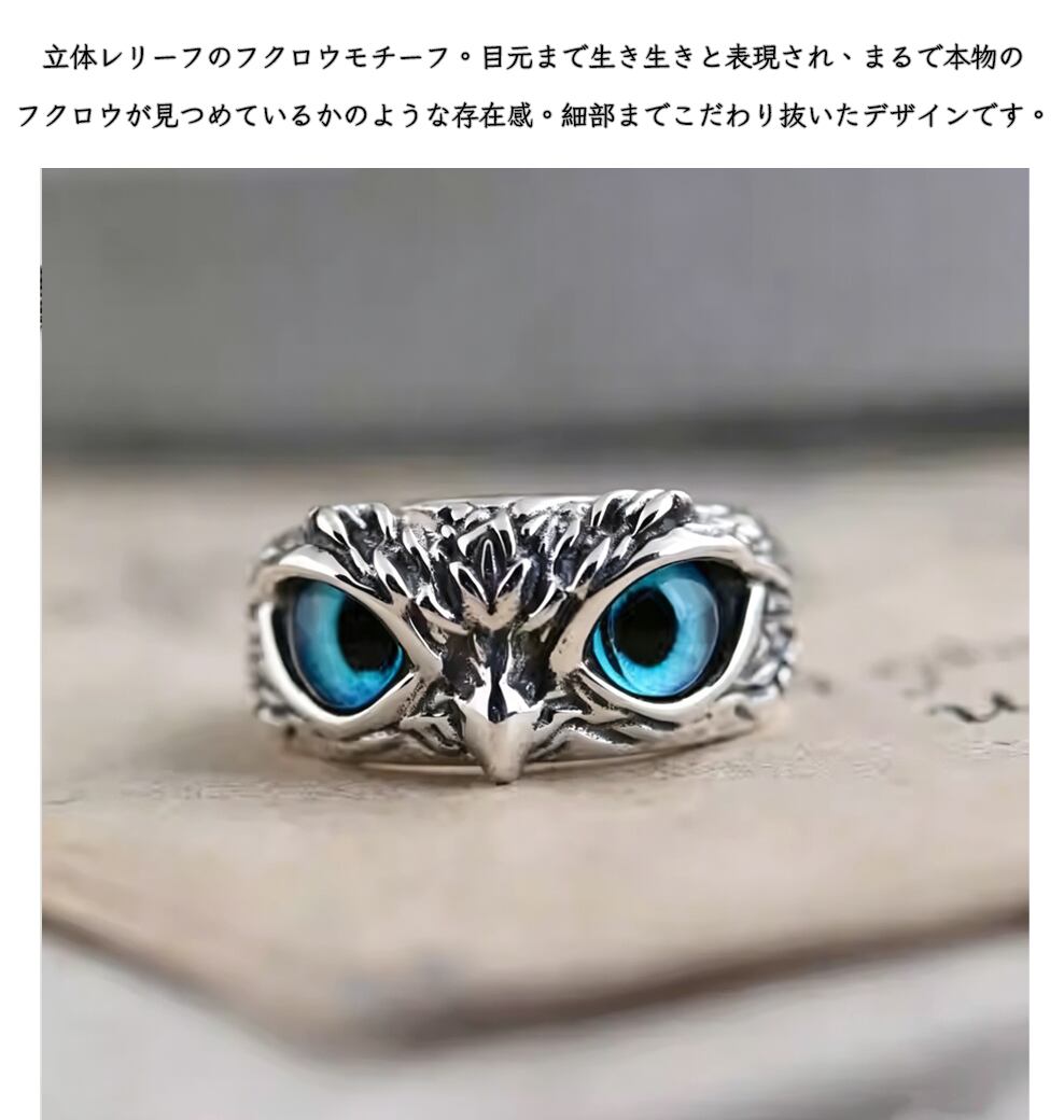 206.フクロウモチーフ メンズリング ブルーアイ 高見え シルバー 個性派 知性デザイン フリーサイズ 調整可能 男性用 指輪 人気