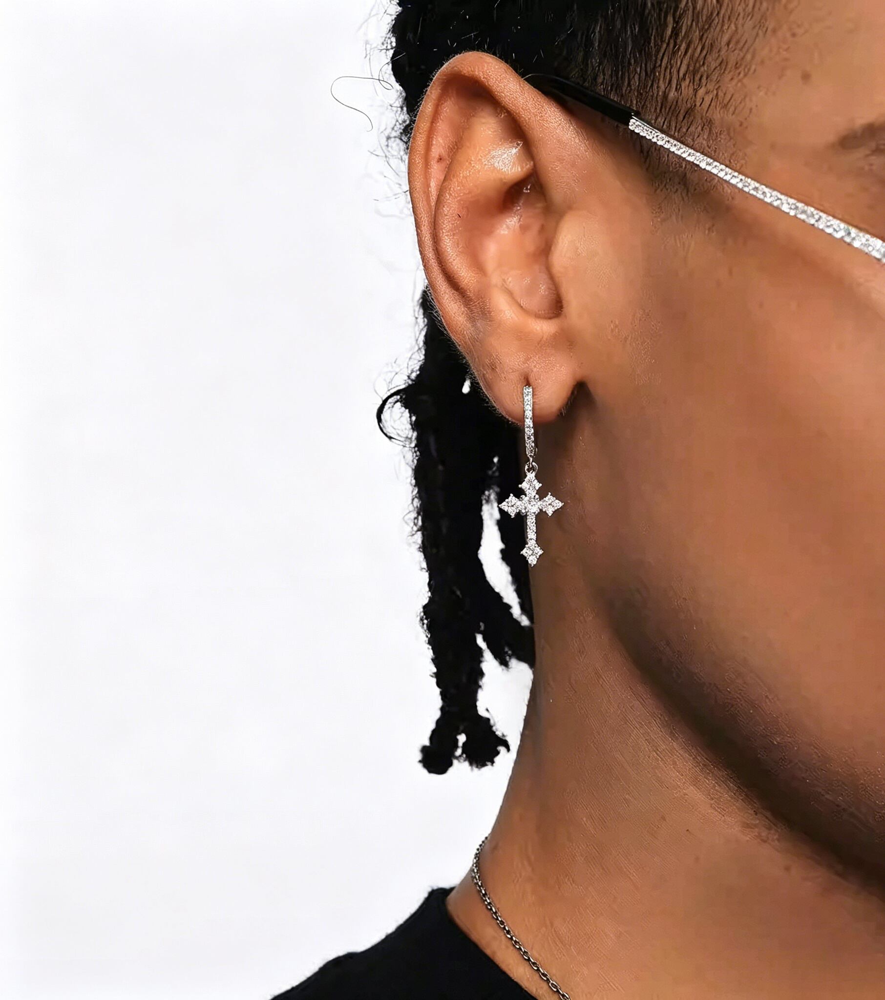 クロスモチーフのメンズピアス。シルバーの輝きが手元にさりげない高級感をプラス。